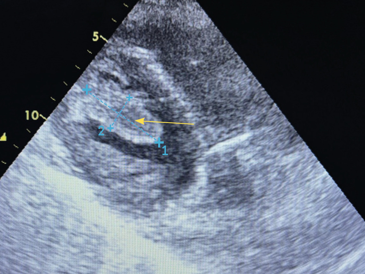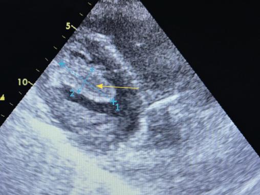 Une échocardiographie transthoracique montre la présence d’un thrombus intraventriculaire gauche (VG) apical (fig. 2), siège d’une akinésie de l’apex et une fonction globale conservée avec fraction d’éjection du VG (FEVG) estimée à 50 %.