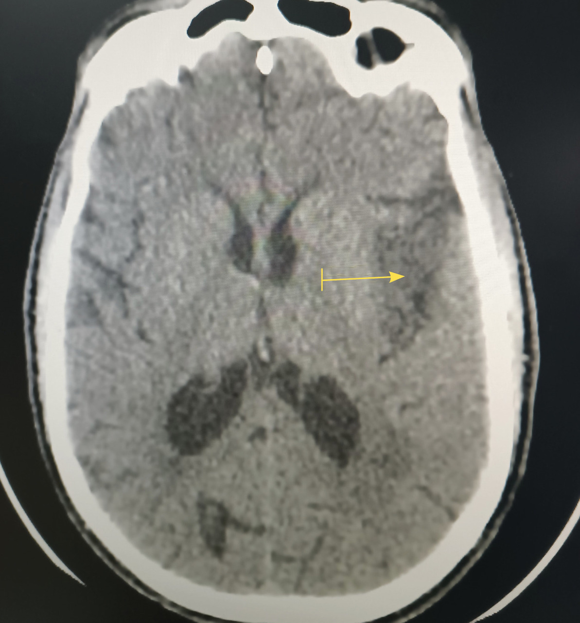 Le scanner cérébral révèle un accident vasculaire cérébral ischémique du territoire de l’artère cérébrale moyenne superficielle gauche (fig. 1).