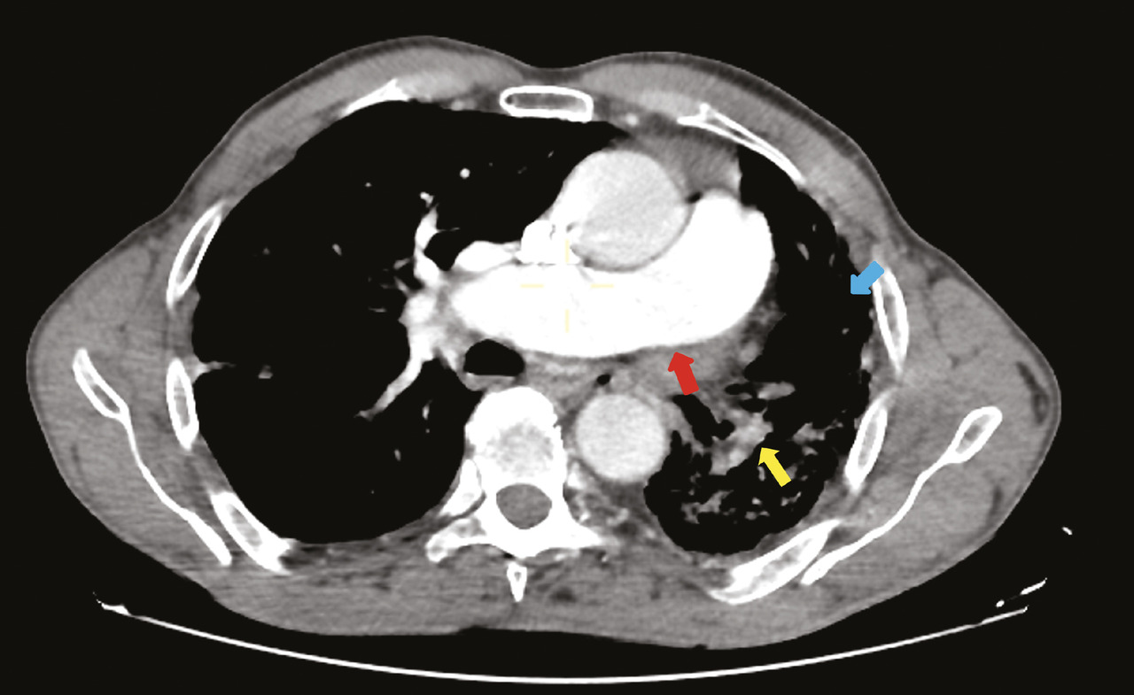 Un homme âgé de 66 ans, sans antécédents particuliers, est admis aux urgences pour la prise en charge d’un traumatisme thoracique minime. Une radiographie thoracique montre une asymétrie de taille des deux champs pulmonaires avec une déviation médiastinale vers la gauche (fig. 1). Un angioscanner thoracique montre une agénésie de l’artère pulmonaire gauche, une hypoplasie du poumon homolatéral et des lacérations vasculaires systémiques d’origine bronchique vascularisant le poumon gauche (fig. 2).