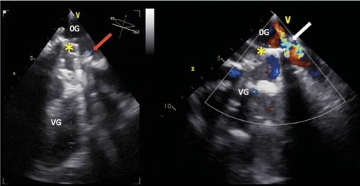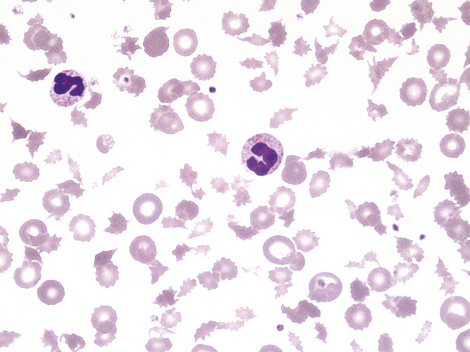 Cette femme de 67 ans avait une asthénie et par intermittence des urines sombres. Une insuffisance mitrale rhumatismale avait été traitée 22 ans auparavant par remplacement valvulaire chirurgical. Le bilan biologique révélait une anémie (7,6 g/dL) normochrome normocytaire régénérative (taux de réticulocytes à 278 000/mm3), un taux de lacticodéshydrogénase à 2 688 UI/L, un taux d’haptoglobine inférieur au seuil de détection et un taux normal de bilirubine totale. Le frottis sanguin (fig. 1 ) notait de très nombreux schizocytes (plus de 500/1 000). L’échocardiographie transœsophagienne (ETO)montrait la présence d’une végétation et une fuite prothétique (fig. 2 ). Il s’agissait d’une endocardite infectieuse à Pseudomonas aeruginosa compliquée d’une désinsertion de valve prothétique.