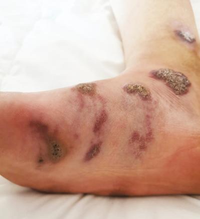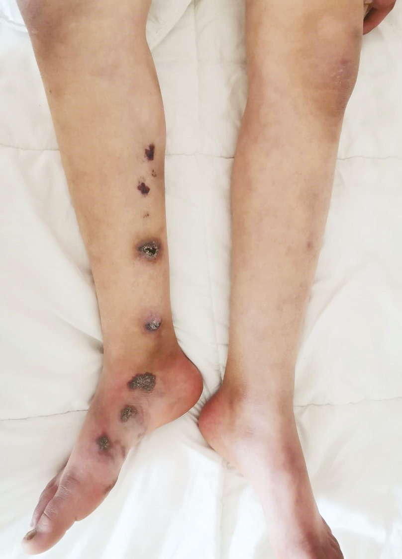 Un enfant âgé de 11 ans, sans antécédents pathologiques notables, consulte pour des lésions maculo-papuleuses érythémateuses sur la jambe droite, évoluant depuis la naissance. L’examen dermatologique objective la présence de plusieurs lésions maculeuses et de lésions nodulaires érythémateuses de couleur pourpre, grossièrement ovalaires (fig. 1 ). D’autres lésions sont linéaires, de contours irréguliers, infiltrées. Certaines sont centrées par une ulcération et recouvertes de croûtes hémorragiques de 1 à 3 cm de grand axe, de disposition linéaire sporotrichoïde (fig. 2 ). Elles ne s’effacent pas à la vitropression, sont sans souffle, battement ni frémissement et sont espacées de zones de peau saine. La biopsie cutanée montre l’aspect histologique d’un angiome en touffes. Le patient n’a pas été traité car les topiques indiqués (sirolimus ou tacrolimus) ne sont pas disponibles au Maroc. Une surveillance régulière a été mise en place ; les lésions sont restées stables et asymptomatiques.