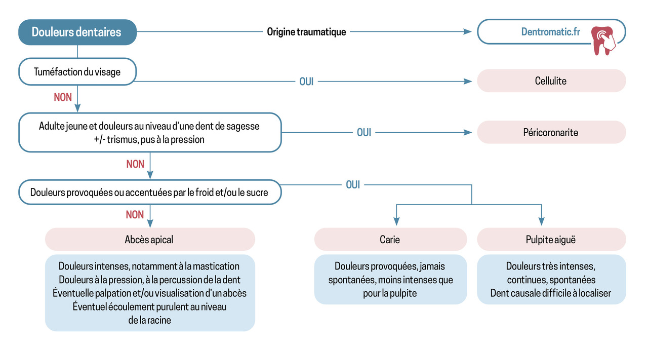 Les origines infectieuses et non infectieuses doivent être distinguées. La figure 2 propose un algorithme d’orientation diagnostique devant une douleur dentaire.