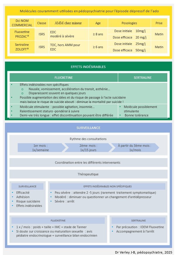La fiche ci-contre précise le maniement, les effets indésirables à connaître et le suivi concernant les deux principaux antidépresseurs utilisés dans l’EDC à l’adolescence.