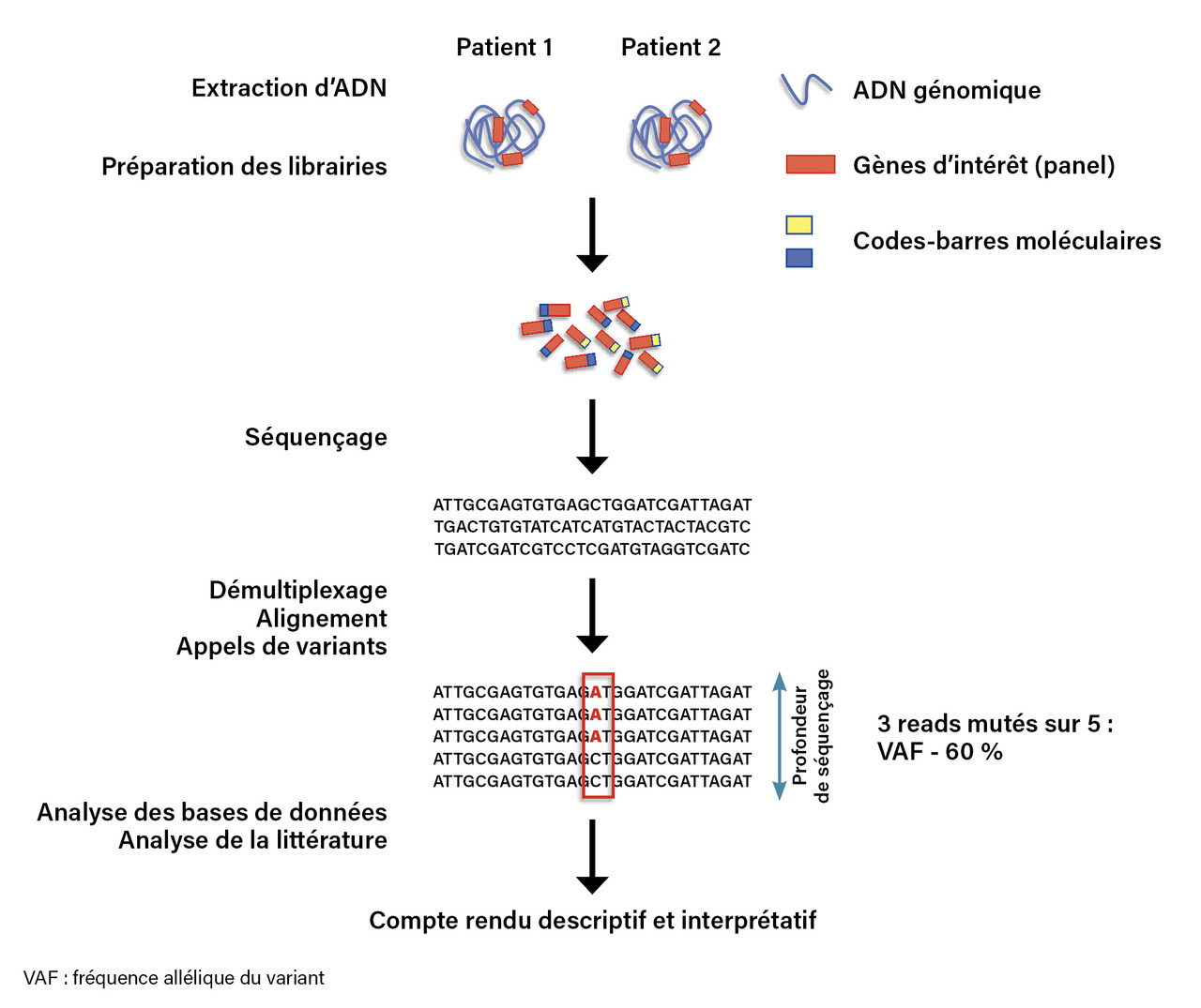 Les fichiers générés par le séquenceur font alors l’objet d’un traitement bio-informatique qui comporte les étapes suivantes : démultiplexage (pour attribuer chaque séquence au bon patient), alignement des séquences sur le génome de référence, appel de variants (pour identifier les variations de séquence par rapport au génome de référence) et annotation des variants par l’utilisation de données publiques. Chacune de ces étapes nécessite une optimisation pour éviter les faux positifs ou les faux négatifs. Le biologiste doit ensuite étudier chaque variant pour ne retenir que ceux qui ont une pertinence clinique. Le compte-rendu comporte une liste de variants identifiés par le nom du gène, le numéro d’ARN messager (NM), la nature des variants sur la séquence nucléotidique (génomique, précédée de g., ou sur l’ADN complémentaire rétrotranscrit à partir d'un ARN messager, précédé de c.) et protéique (précédée de p.) et la fréquence allélique du variant (VAF par utilisation de l’acronyme anglais variant allele frequency) qui correspond à la proportion de lectures du variant par rapport à celles de la référence et qui est un reflet de la taille du clone tumoral portant la mutation. Chaque variant est assorti d’une prédiction d’effet selon des recommandations internationales (variant pathogène, probablement pathogène, de signification indéterminée, probablement bénin ou bénin).5,6 Enfin, une interprétation du profil moléculaire dans sa globalité est indispensable pour guider la décision clinique.