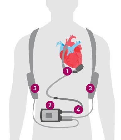 En pratique, le seul dispositif actuellement disponible en France est la pompe HeartMate 3. Il s’agit d’une pompe centrifuge à débit continu connectée à un système de contrôle par un câble transcutané et alimentée en électricité par des batteries portées à la ceinture ou en bandoulière, conférant une autonomie de quelques heures (fig. 2).