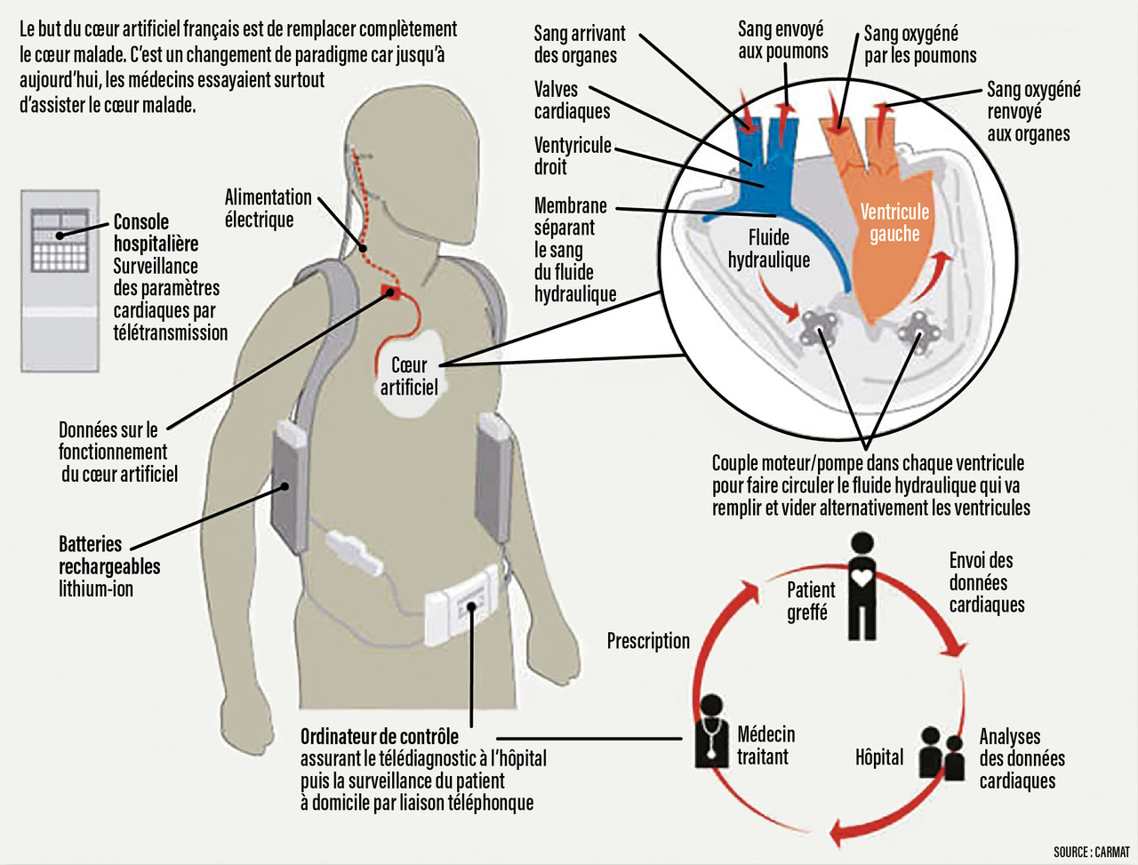 Le cœur SynCardia a été implanté chez plus de 1 700 malades ; il utilise une technologie déjà ancienne (le cœur de Jarvik) et expose à un taux élevé de complications infectieuses.