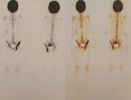 Un homme de 77 ans décrit des céphalées chroniques avec hypoacousie profonde. L’examen clinique constate une macrocrânie. La radiographie du crâne de profil montre un aspect cotonneux avec des lésions ostéocondensantes et lytiques (fig. 1). Les phosphatases alcalines sériques sont à 1 700 UI/L (13 fois la normale). Le taux de protéine C-réactive (CRP) est de 7 mg/L. La calcémie est à 91 mg/L. La scintigraphie osseuse met en évidence une hyperfixation intense du crâne, des mandibules, de l’aile iliaque gauche, de l’ischion gauche, du sacrum, de l’arc moyen de la 8e côte droite et de la 4e vertèbre lombaire (fig. 2). Ces anomalies sont typiques de la maladie osseuse de Paget. Un traitement par acide zolédronique a été initié, puis le patient a été perdu de vue.