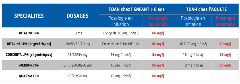 Attention : certains patients peuvent rapporter des effets « fin de dose » où l’efficacité du traitement diminue et les symptômes du TDAH réapparaissent. Cela se produit habituellement en fin d’après-midi et en soirée. Dans ces cas, il est possible d’introduire une forme LI en fin d’après-midi, à la dose minimale efficace (exemple : Ritaline LI 5 mg à 17 h ; voir tableau).