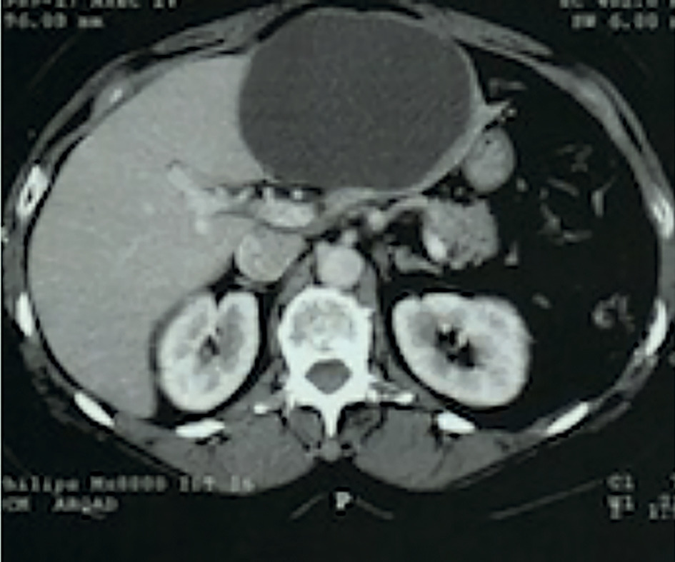 Cette masse augmentant rapidement, avec intensification des douleurs et apparition d’une gêne à l’inspiration, un scanner abdominal avec injection est demandé en urgence. Il confirme un volumineux kyste liquidien occupant tout le segment hépatique n° III (