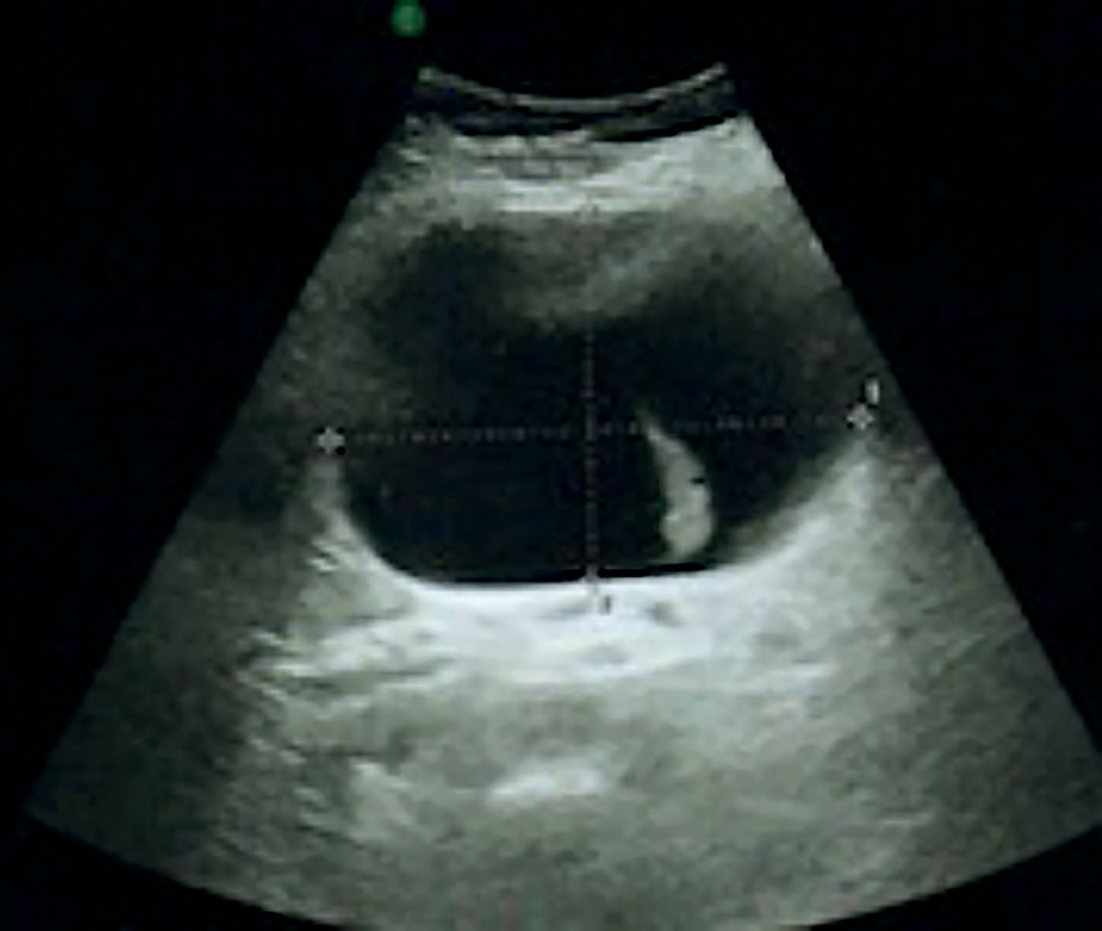 L’exploration biologique est strictement normale, sans cytolyse hépatique. L’échographie abdominale révèle un macrokyste de 10 cm à l’épigastre, contenant une cloison (fig. 1 ).