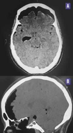 Cette femme de 38 ans consultait pour des céphalées en casque évoluant depuis une semaine. La patiente précisait avoir une rhinorrhée antérieure depuis une intervention neurochirurgicale sur adénome hypophysaire réalisée un mois auparavant. L’examen ne notait ni atteinte des paires crâniennes ni céphalée orthostatique. La patiente était apyrétique et son bilan biologique ne montrait pas de syndrome inflammatoire ou infectieux. Une liquorrhée cérébrospinale était visualisée au contact du sphénoïde à la rhinoscopie. La tomodensitométrie cérébrale était normale (fig. 1 ). La patiente était hospitalisée et, le soir même, chutait dans la salle de bains. Une nouvelle tomodensitométrie (48 h après la première) montrait une pneumencéphalie diffuse témoignant d’une brèche méningée (fig. 2 ). La chute a probablement accentué la brèche, occasionnant la pneumencéphalie secondaire.