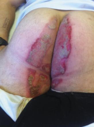 Un patient de 25 ans consulte après avoir participé à un « jeu » d’alcool : du papier toilette est inséré entre les fesses en guise de mèche. Elle est allumée, et il faut boire une bière le plus rapidement possible puis éteindre le feu avant de se brûler. Malheureusement, l’état d’ébriété avancé du jeune homme ne lui a pas permis suffisamment de réactivité. Il souffre de brûlures périnéales au deuxième degré superficiel et au deuxième degré profond (figure).
