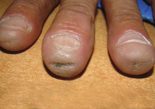 Des onychoses traumatiques sont également décrites : dystrophie lamellaire (dédoublement de l’ongle ou onychorrhexie) ou leuconychie (taches blanches à la surface de la tablette).