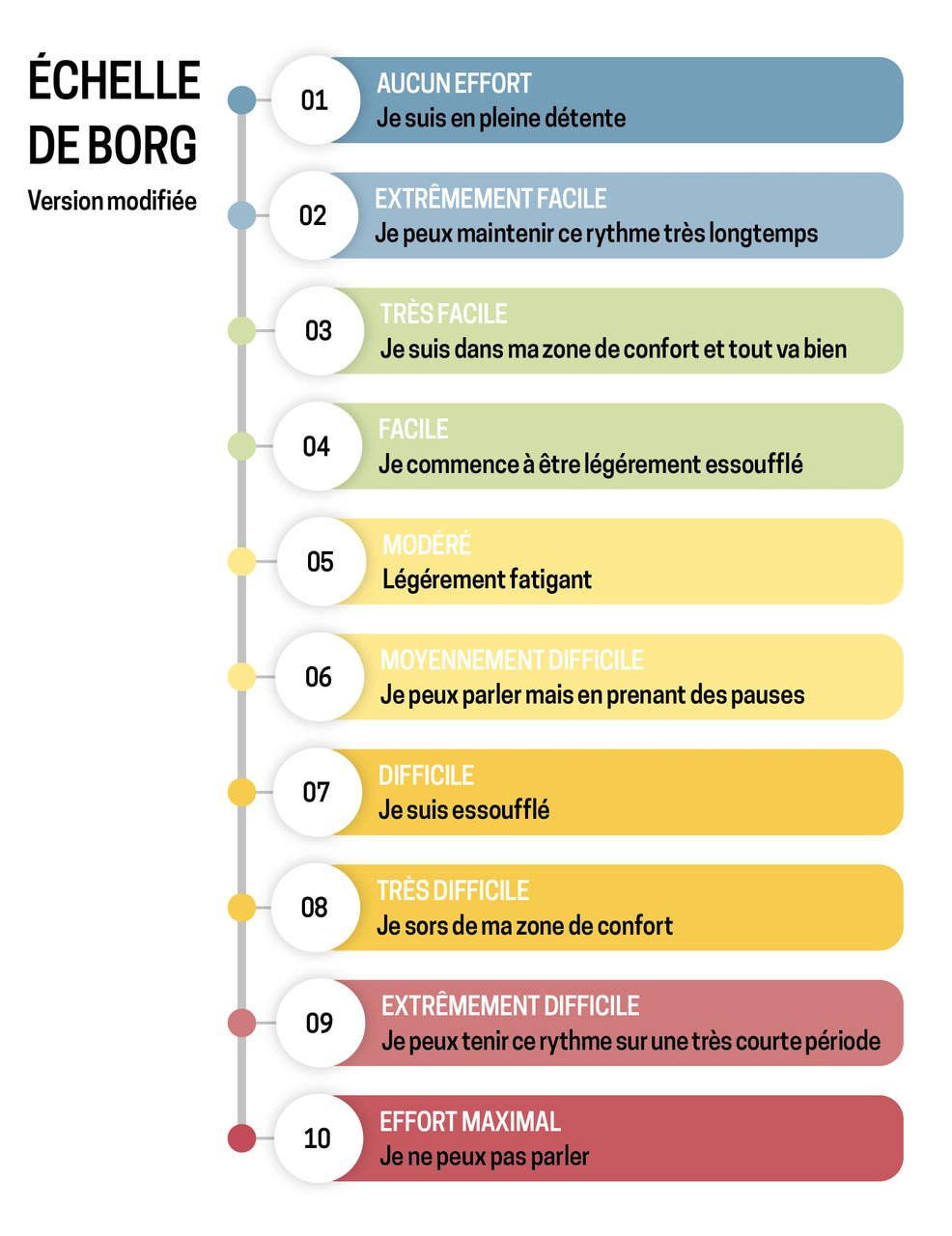 Pour aider le patient et le prescripteur dans le suivi, des repères simples peuvent être utilisés, comme l’essoufflement et la pénibilité (échelle de Borg [figure]), afin d’évaluer le volume et l’intensité de l’activité physique.