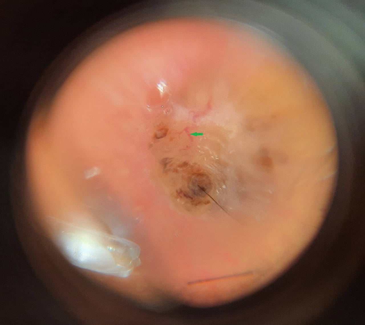 Le diagnostic peut être posé par une dermatoscopie objectivant des télangiectasies à l’aspect de tronc d’arbre (vaisseaux bien limités, surmontant la lésion maligne) [figure 2, flèche verte]. L’examen anatomopathologique permet de confirmer le diagnostic en mettant en évidence des kératinocytes tumoraux regroupés à la membrane basale, mais aussi d’importants îlots de cellules tumorales au niveau du derme.