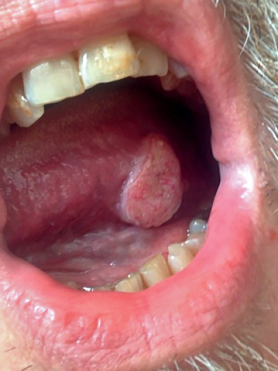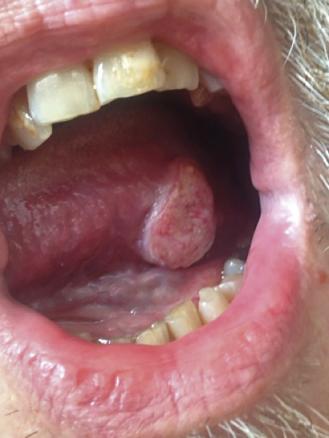 Thierry, 47 ans, alcoolotabagique, consulte pour tuméfaction latéro-linguale évoluant depuis quelques semaines, de 2 cm de diamètre, non ulcérée, peu sensible à la palpation, indurée et adhérente au plan profond. La biopsie révèle qu’il s’agit d’un carcinome épidermoïde (bilan d’extension négatif). Une exérèse est réalisée, avec greffe de peau pour guider la cicatrisation.