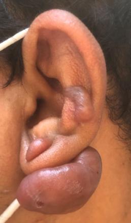 Cliniquement, les chéloïdes s’étendent au-delà des limites initiales de la plaie. Elles sont papulo-nodulaires, fermes, lisses, aux berges irrégulières et de couleur rosée ou discrètement pigmentées. Elles peuvent être responsables d’un prurit, de douleurs et surtout de séquelles esthétiques.