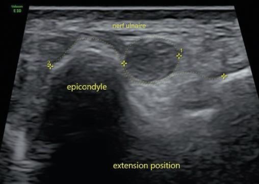 Deux ans après le premier épisode, il reconsulte pour le même motif. Un nouvel EMG révèle un ralentissement de la vitesse de conduction du nerf ulnaire droit au niveau du coude. Une échographie dynamique du coude met en évidence un gonflement fusiforme du nerf ulnaire dans la gouttière cubitale ainsi qu’une luxation du nerf ulnaire au-delà de la tubérosité condylienne lors de la flexion de l’avant-bras sur le bras (fig. 1 et 2). Une transposition cubitale est effectuée (fig. 3) permettant la disparition des symptômes en quelques semaines.
