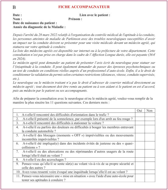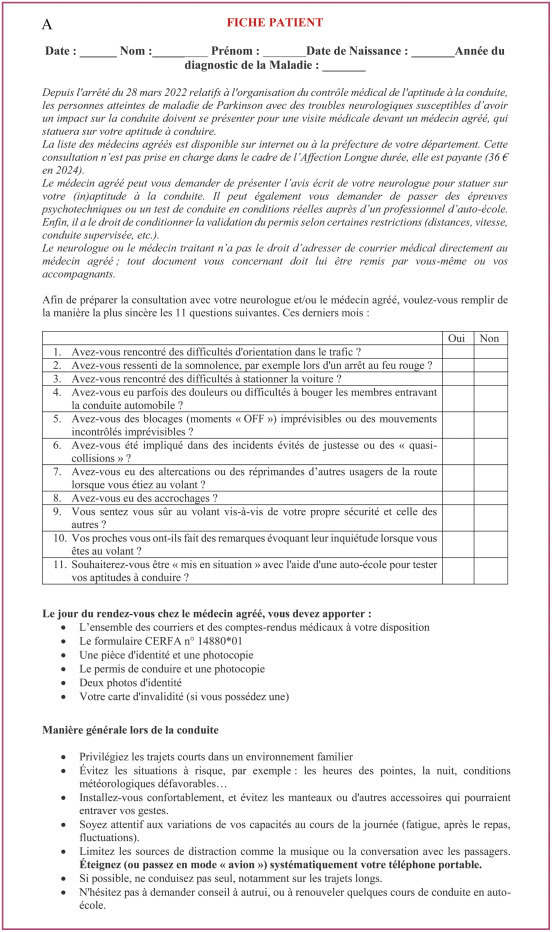 Laurens B, Bonnet C, Bonnet M, et al. Recommandations pour l’accompagnement et l’orientation vis-à-vis de la conduite automobile des personnes atteintes de maladie de Parkinson ou d’un syndrome parkinsonien : un consensus de la Société francophone des mouvements anormaux (SOFMA). Prat Neurol FMC 2025;16(3):163-77.