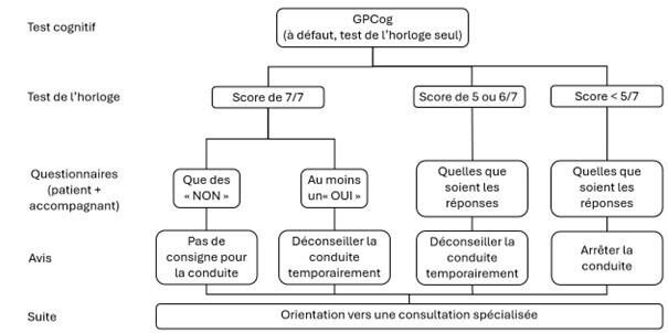 La démarche d’évaluation pour le médecin traitant repose sur un protocole d’évaluation simplifié à destination des MG, adapté au temps dont ils disposent et basé sur des outils connus et standardisés comme le GPCog (ou le seul test de l’horloge, présent dans le GPCog, si le temps manque), et sur un autoquestionnaire pour le patient et pour l’accompagnant qui a pour vocation à dépister des signaux d’alerte (pertes de repères, non reconnaissance de certains panneaux, accrochages récents, difficultés pour utiliser la voiture…). Ces documents se retrouvent en annexe de la publication ci-jointe, ainsi que les avis à donner suivant les résultats de ces évaluations (voir figure 1). Si le MG suspecte une incompatibilité, il conseille l’arrêt de la conduite et demande un avis spécialisé auprès d’une équipe pluriprofessionnelle qui comprend au moins un médecin spécialiste. S’il considère que le patient a des troubles cognitifs inconciliables avec la conduite, le MG dit à son patient de ne pas reprendre le volant dès la sortie de la consultation et inscrit dans le dossier de ce dernier le fait qu’il a donné cette information. Dans le cas où il est certain que le patient n’a pas de troubles, il doit également l’annoncer à son patient et inscrire dans son dossier le fait qu’il a donné cette information.