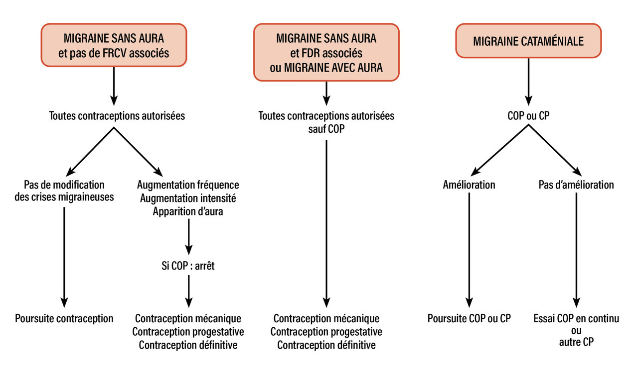 - la COP est contre-indiquée en cas de migraine avec aura ou en cas de facteur(s) de risque artériel associé(s) chez une femme ayant des migraines sans aura. La contraception fait alors appel aux autres stratégies contraceptives disponibles.