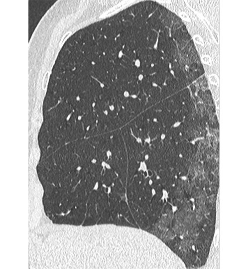 Image : Tomodensitométrie. Patiente de 71 ans sans antécédent, atteinte de Covid-19, ayant une pneumopathie interstitielle. Aspect typique initial : atteinte bilatérale à type de verre dépoli périphérique sous-pleural. Crédit : Société française de radiologie (https://bit.ly/39NaivY).