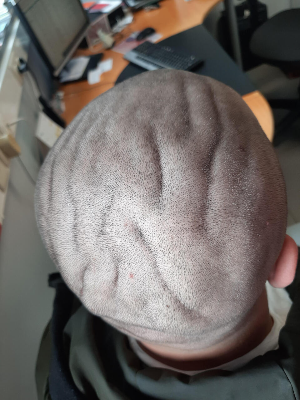 Un patient âgé de 15 ans consulte, à la demande de sa mère, qui s’inquiète de l’aspect de son cuir chevelu. Le jeune homme, qui n’a aucun antécédent personnel ni familial, reconnaît avoir occasionnellement des démangeaisons à ce niveau. À la palpation, la structure du cuir chevelu est normale à certains endroits mais plus épaisse et moins souple à d’autres ; cette alternance forme des plis (figure).