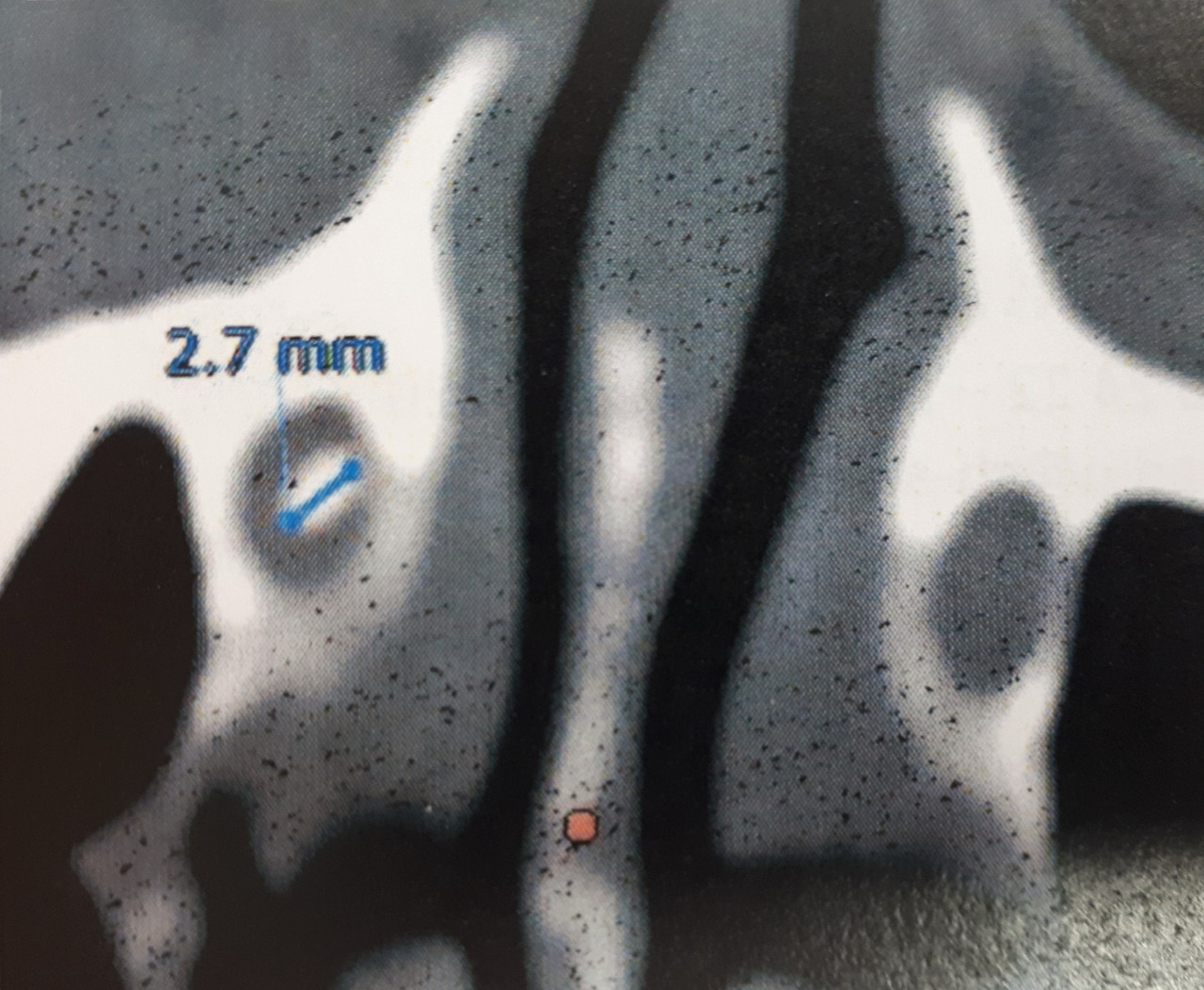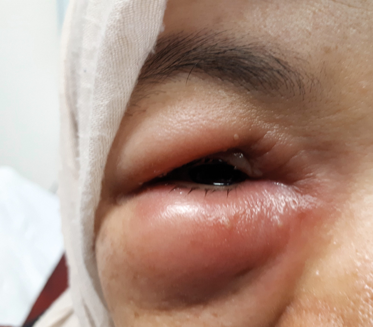 Une patiente âgée de 56 ans, sans antécédent notable, consulte aux urgences pour une douleur de la face associée à un œdème palpébral droit (fig. 1). À l’interrogatoire, elle décrit l’apparition quarante-huit heures auparavant d’un œdème palpébral avec une majoration au décours et l’apparition, depuis douze heures, d’une douleur périorbitaire sans fièvre associée. Elle décrit dans les mois précédents une sensibilité du bord interne de l’œil droit évoluant de manière intermittente avec un larmoiement associé. Un bilan sanguin retrouve une protéine C réactive (CRP) à 15 mg/L sans hyperleucocytose. Un scanner conclut à une cellulite périorbitaire débutante sur dacryocystite en lien avec un dacryolithe du canal lacrymal de 2,7 mm (fig. 2). Les symptômes s’amendent en quarante-huit heures après l’introduction d’une antibiothérapie probabiliste avant une prise en charge chirurgicale à distance de l’épisode.
