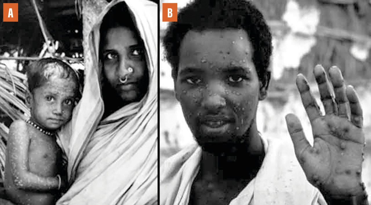 Finalement, après des années de lutte intensive, le dernier cas spontané de variole majeure est enregistré au Bangladesh, dans l’île de Bhola, le 16 octobre 1975, chez une petite fille de 2 ans, Rahima Banu (fig. 5A). Le dernier refuge de la variole aura été la Corne de l’Afrique, où sévissait surtout la variole mineure. Le dernier cas de variole, un patient nommé Ali Maow Maalin souffrant d’alastrim, survient le 27 octobre 1977 en Somalie (fig. 5B). Le 8 mai 1980, l’OMS annonce officiellement l’éradication de la variole de la surface du globe. Le coût de la campagne qui a mobilisé 100 000 personnes sur le terrain n’a été que de 300 millions de dollars !