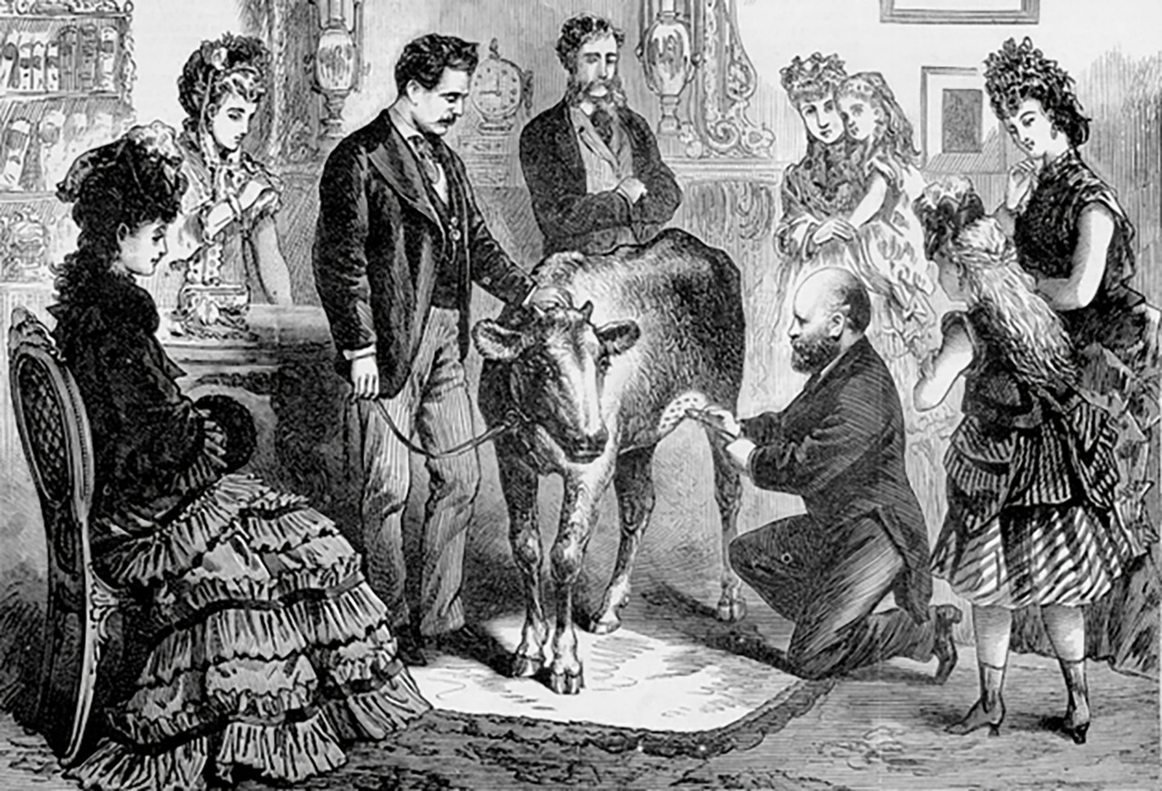 En dépit de ces succès, la diffusion du procédé est entravée par les sources parcimonieuses de vaccine et par la durée de protection qui diminue après une dizaine d’années, nécessitant des rappels. Les épizooties de cowpox sont rares et imprévisibles, ce qui peut entraîner des pénuries plus ou moins longues. C’est pourquoi Jenner avait très tôt proposé la vaccination de bras à bras, seul moyen d’avoir une source continue de vaccine, sans affaiblissement ou perte de la virulence de la lymphe (fig. 3). Cependant, au cours du XIXe siècle, ce procédé a été à l’origine de transmission de maladies comme la syphilis, l’érysipèle ou l’hépatite. Comment éviter ce risque infectieux ? La solution adoptée a été la « rétrovaccination », c’est-à-dire l’inoculation de la vaccine à des génisses qui deviennent une source sûre et stable de lymphe. Cette pratique utilisée à Naples depuis le début du XIXe siècle est amenée en France en 1864 par Gustave Lanoix et Ernest Chambon, qui créent l’Institut de vaccine animale et diffusent le procédé dans le monde (fig. 4). La production peut désormais être standardisée et la conservation améliorée par l’addition de glycérine, par congélation et par lyophilisation. Ces progrès techniques se sont avérés essentiels pour conserver partout la vaccine, en particulier dans les pays tropicaux.