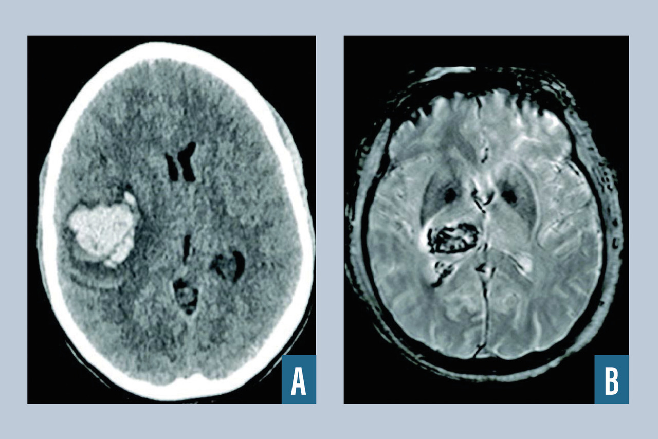 L’hématome intracérébral est une collection de sang consécutive à la rupture d’un vaisseau intracrânien (fig. 2 ). L’hypertension artérielle est la première cause, et l’hémorragie est alors très souvent localisée au niveau des noyaux gris centraux. Lorsque l’hémorragie est située en superficie, elle est dite lobaire, et après 50 ans, le diagnostic d’angiopathie amyloïde est fréquemment rencontré après exclusion des autres diagnostics (tumeurs, traumatisme…). Une autre cause est la rupture d’une malformation vasculaire, que ce soit une malformation artérioveineuse, un anévrisme ou un cavernome. Parmi les autres causes, on cite la thrombophlébite cérébrale et les troubles de la coagulation spontanés ou iatrogènes (traitements antithrombotiques). Le scanner cérébral, qui est l’examen de référence en cas d’hémorragie cérébrale, met en évidence une plage en hyperdensité et est le plus souvent complété par un scanner cérébral avec injection et un angioscanner cérébral à visée étiologique (recherche de tumeur, de malformation vasculaire, de thrombose veineuse cérébrale). L’IRM cérébrale avec ARM peut être intéressante lorsque le scanner n’est pas contributif pour rechercher une cause de l’hémorragie (stigmates de maladies des petites artères liées à l'âge et à l'hypertension artérielle, angiopathie amyloïde, tumeur cérébrale). En l’absence de cause retrouvée à la phase aiguë, l’IRM cérébrale injectée doit être réitérée à trois mois pour s’assurer de l’absence de lésion sous-jacente. Le recours à l’artériographie cérébrale est fréquent dans le cadre du bilan étiologique de l’hématome du sujet jeune, en l’absence de cause évidente.