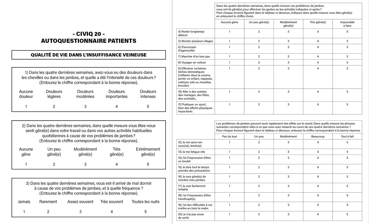 En complément de la classification CEAP, l’usage du score de sévérité clinique VCSS (venous clinical severity score) [tableau ] est recommandé pour les patients ayant des troubles veineux chroniques afin d’évaluer la gravité clinique et les résultats après réalisation d’un traitement. Le VCSS révisé est un instrument d’évaluation physique utile pour décrire la gravité des troubles veineux chroniques : il est sensible aux changements de symptomatologie dans le temps et permet de documenter la réponse au traitement. Le VCSS ainsi que la classification CEAP ont été largement adoptés dans les directives internationales. Le VCSS comprend dix catégories, chacune classée sur une échelle de 0 à 3 : douleur, varices, œdème, pigmentation, inflammation, induration, présence, durée et taille des ulcères et utilisation de la thérapie par compression. Le VCSS est validé et il existe une corrélation entre VCSS, CEAP, chronic venous insufficiency questionnaire (CIVIQ) modifié (instrument de mesure des résultats rapportés par les patients) [figure ] et les résultats de l’écho-Doppler veineux. La corrélation la plus forte concerne la douleur (r = 0,55, p < 0,0001). Une bonne corrélation a également été trouvée dans la capacité du VCSS et de l’échelle de Villalta-Prandoni18 à détecter la MVC post-thrombotique légère à modérée. D’autres classifications, comme le score de Widmer ou l’échelle MOS SF-36, peuvent être utilisées.