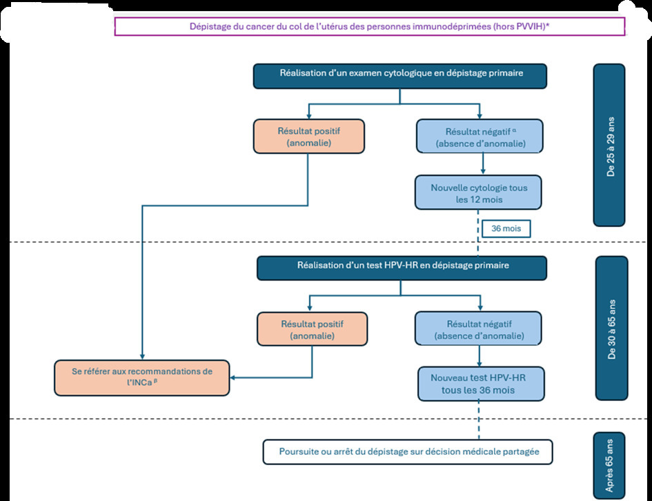 Pour les femmes de 30 ans et plus, compte tenu de l’excellente valeur prédictive négative du test HPV-HR et de l’histoire naturelle de l’infection par le HPV, il a été jugé peu probable par l’ANRS-MIE et le CNS (sur avis d’experts) qu’un cancer du col avancé se développe dans les 5 ans suivant un résultat négatif au test HPV-HR. Par conséquent, des recommandations identiques à celles de la population générale s’appliquent pour les femmes ≥ 30 ans, même en cas d’immunosuppression avancée.