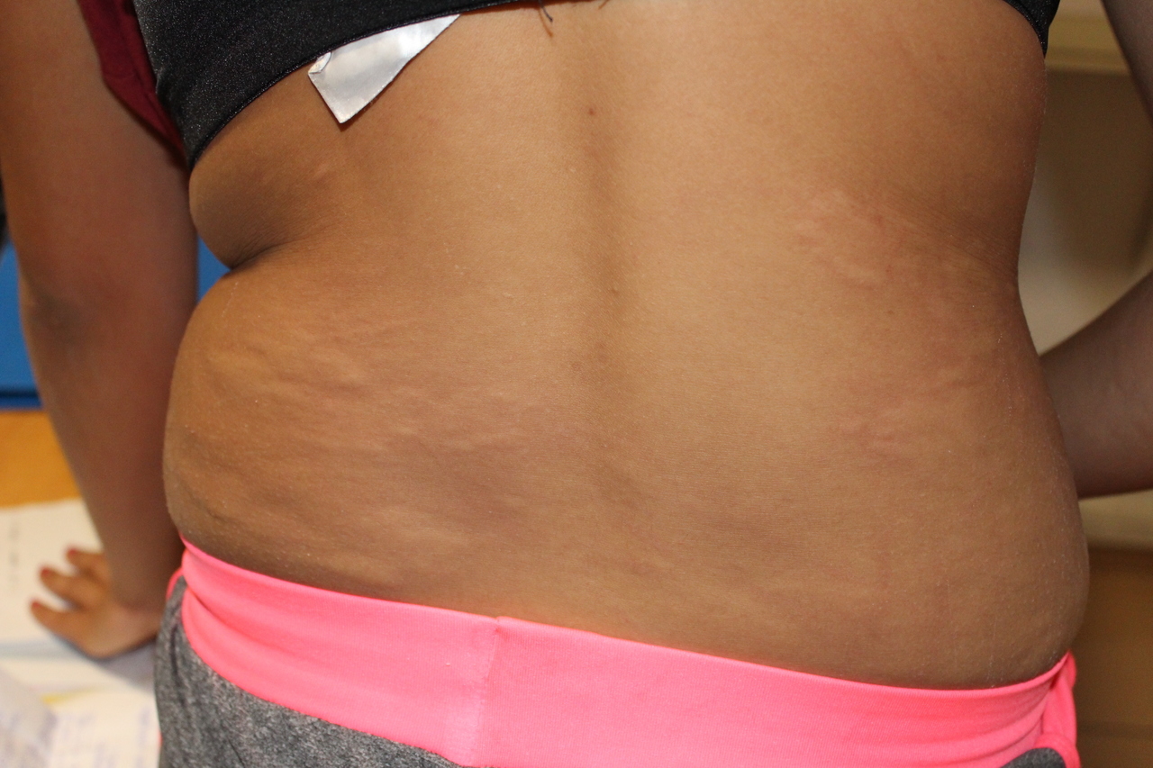 Mélanie, 19 ans, enceinte (34e SA), consulte pour des lésions papuleuses prurigineuses apparues depuis quelques jours sur son abdomen. Initialement de petite taille (< 1 cm), elles forment des placards au niveau du dos et des cuisses.