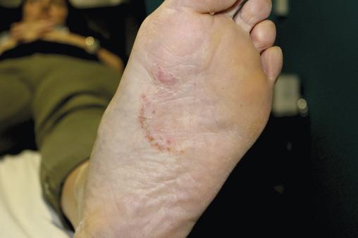 Monique, 63 ans, consulte pour une lésion prurigineuse apparue au niveau de la plante de pied : circulaire, ses bords sont limités par un bourrelet formé de vésicules et d’éléments hyperkératosiques. L’application d’un dermocorticoïde n’a pas eu d’effet.