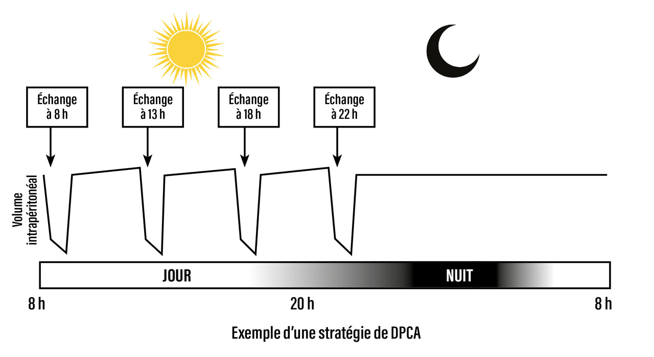 La dialyse péritonéale cyclique ambulatoire (DPCA) est réalisée de jour.