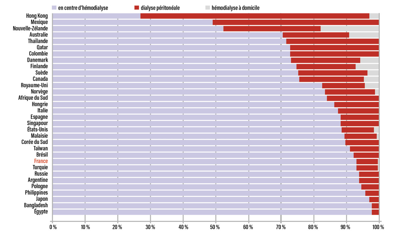 Le pourcentage de patients traités par dialyse péritonéale dans le monde est de l’ordre de 11 %, avec une grande variabilité internationale (fig. 1). En effet, dans plusieurs pays comme Hong Kong, la Nouvelle-Zélande et la Colombie, plus de 30 % de patients atteints de MRC5 sont traités par DP ; dans d’autres, comme la Finlande, le Danemark, les Pays-Bas, ce taux est de l’ordre de 20 % ; enfin, dans certains pays comme la France, l’Allemagne, le Portugal, la Belgique, le Royaume-Uni, cette proportion est inférieure à 10 %. Depuis quelques années, certains pays ont une tendance significative à augmenter le nombre de patients pris en charge en DP tels que les États-Unis, le Bangladesh, le Chili, l’Espagne, l’Argentine, la Thaïlande et Taïwan.1