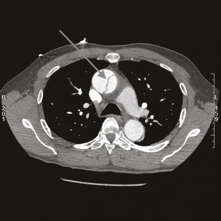Cet homme de 55 ans, sans antécédent, avait appelé le 15 pour une douleur thoracique irradiant dans la mâchoire et des paresthésies du bras droit, après un effort de marche. À l’examen la pression artérielle était de 165/85 mmHg symétrique, les pouls étaient symétriques, et il n’y avait pas de déficit moteur des 4 membres. L’électrocardiogramme montrait un léger sous-décalage du segment ST en DIII et AvF. Le médecin du SMUR retenait le diagnostic de syndrome coronaire aigu « non ST+ » et orientait le patient vers une unité de soins intensifs cardiologiques où la tomodensitométrie thoracique (fig. 1) révélait finalement une dissection aortique de type A étendue de la racine de l’aorte jusqu’à l’ostium de l’artère carotide primitive gauche (fig. 2).