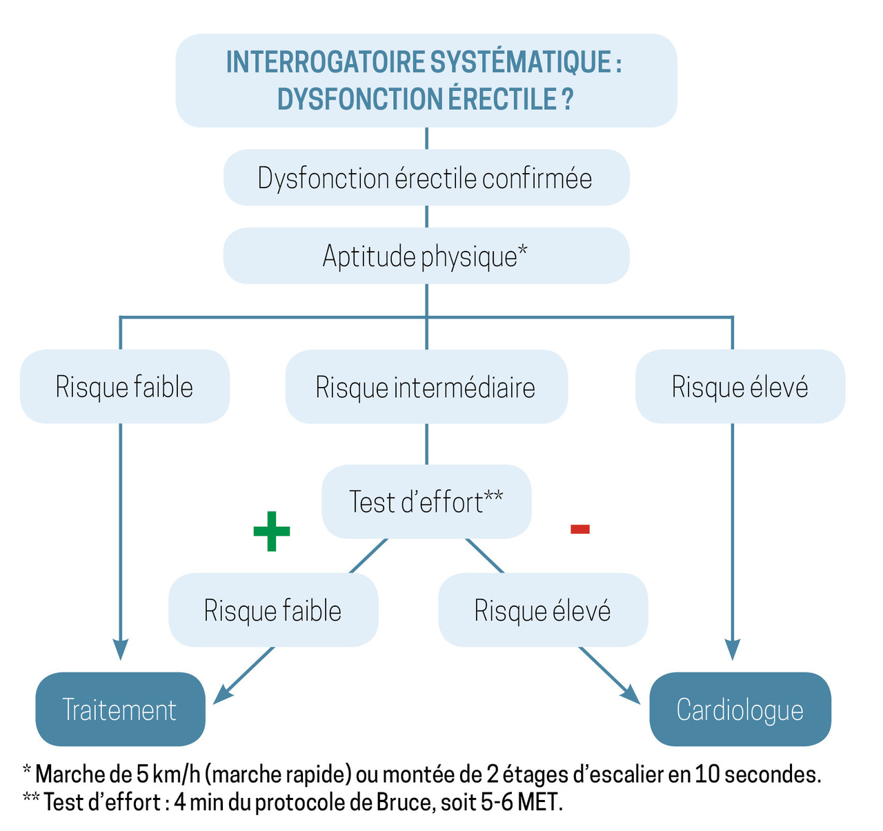 Ainsi, l’évaluation du risque d’accident cardiovasculaire selon le score de Framingham montre qu’en présence d’une DE le risque de maladies coronariennes à dix ans est multiplié par 2 entre 40 et 50 ans. Un avis cardiologique doit être demandé en fonction de l’aptitude physique du patient et du nombre de ses facteurs de risque cardiovasculaires (