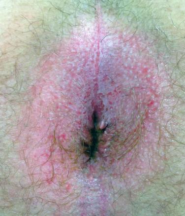 L’eczéma de contact est l’une des causes les plus fréquentes de prurit anal. Il est classiquement provoqué par un allergène. Les plus souvent mis en cause sont des conservateurs (papier hygiénique parfumé, lingettes, gel douche, parfum, mais aussi topiques hémorroïdaires, etc.). Le contexte atopique (asthme, rhinite, etc.) est évocateur. La dermite de contact est différente car elle relève d’une irritation directe par une substance irritante (antiseptiques, sous-vêtements en nylon, selles, etc.).