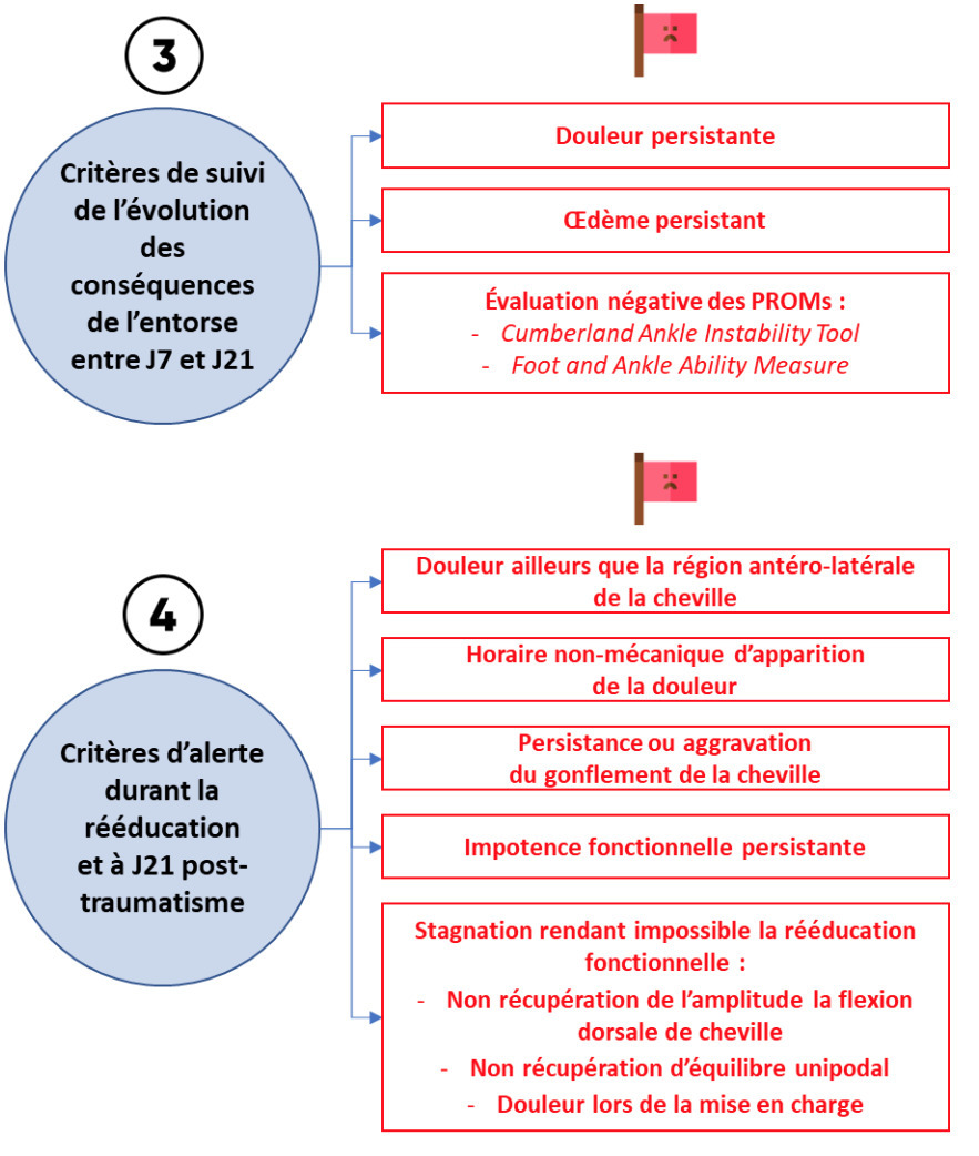 Lors de l’évaluation à J5 -J7, la présence d’un des critères d’Ottawa et Bernois, de douleur aux premiers pas lors de la marche, le maintien d’une impotence fonctionnelle (ex. : maintien de l’usage d’aides techniques lors de la marche) ou de la consommation d’antalgiques de palier II doivent faire adresser le patient au spécialiste. En cas de signes faisant suspecter un syndrome de la syndesmose (douleur à la palpation du ligament tibio-fibulaire antéro-inférieur), demander une échographie de la cheville et du pied. En cas de persistance d’une importante impotence fonctionnelle à la marche, demander une radiographie standard si elle n’a pas été réalisée antérieurement ou, dans le cas contraire, d’une tomodensitométrie et/ou une échographie.