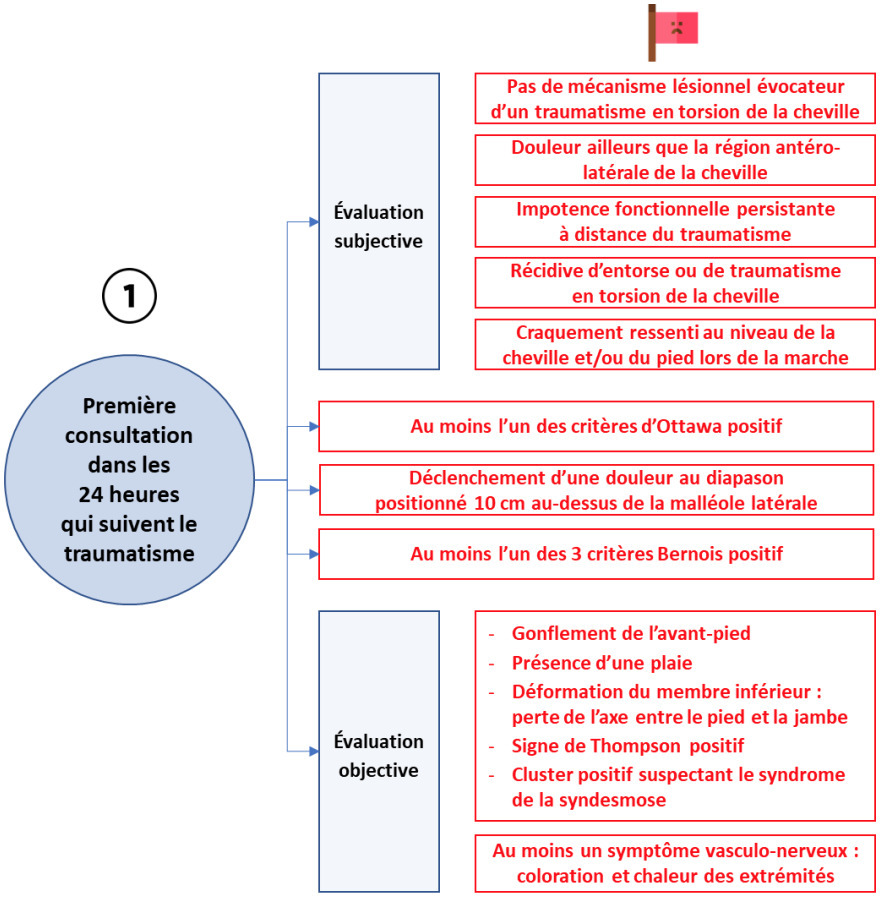 La première consultation avec un médecin généraliste ou un masseur-kinésithérapeute (exerçant dans le cadre de l’accès direct ou d’un protocole national de coopération) doit être réalisée idéalement dans les 24 heures suivant le traumatisme ; elle est suivie d’une réévaluation à J5 -J7.