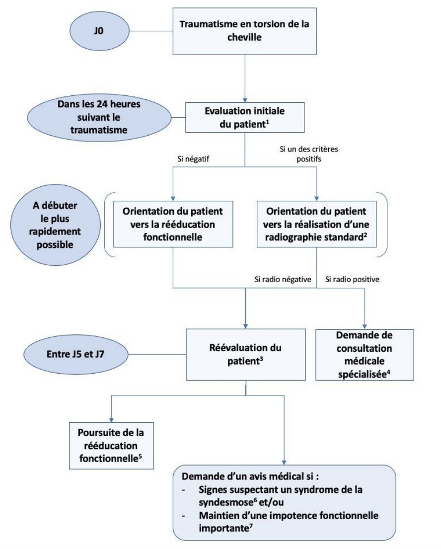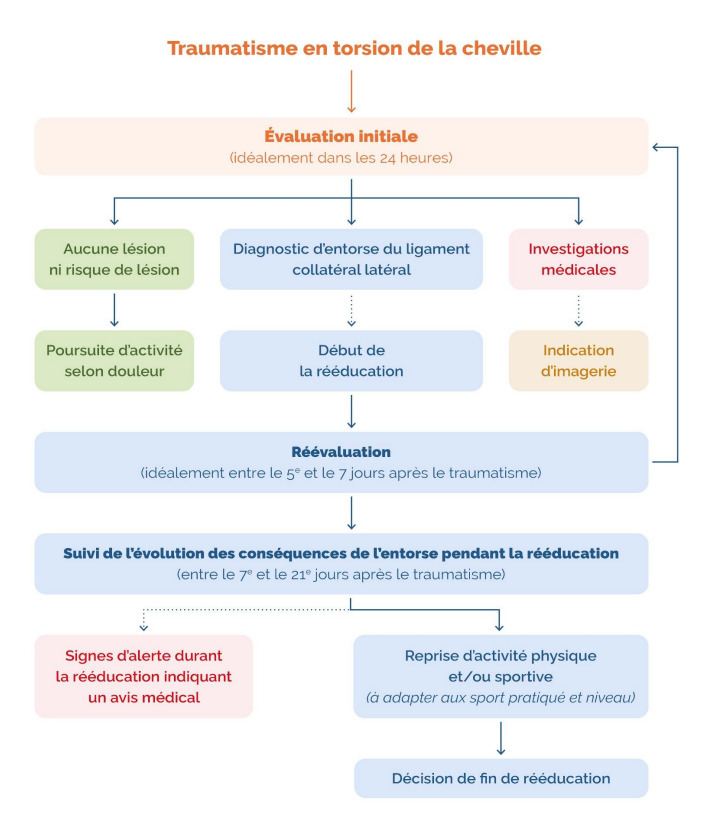 Après un traumatisme en torsion de cheville, la HAS recommande un parcours de soins selon les étapes indiquées sur la figure 2.