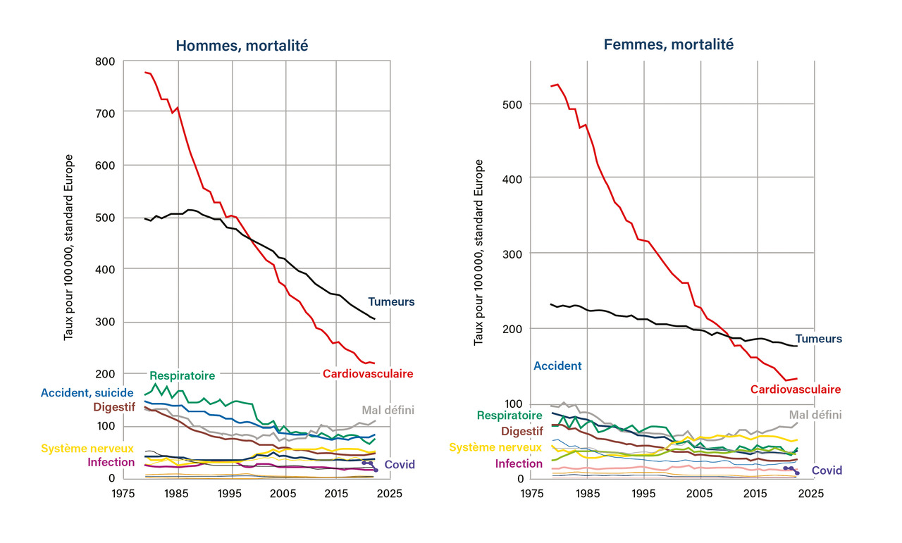 Le cancer est la première cause de décès en France, c’est vrai depuis 1998 et 2009, respectivement chez les hommes et les femmes. Mais la figure 4 montre que c’est parce que la mortalité cardiovasculaire diminue beaucoup plus rapidement que la mortalité par cancer.