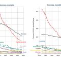 Entre 15 et 39 ans, l’incidence a augmenté fortement jusqu’en 2012 chez les hommes et chez les femmes, mais l’augmentation est moindre dans les années récentes ; la mortalité diminue chez les hommes depuis 1970 et chez les femmes depuis 1960. Entre 0 et 14 ans, l’incidence n’augmente pas chez les garçons et augmente très faiblement chez les filles, et la mortalité diminue depuis la fin des années 1950 (fig. 3B).