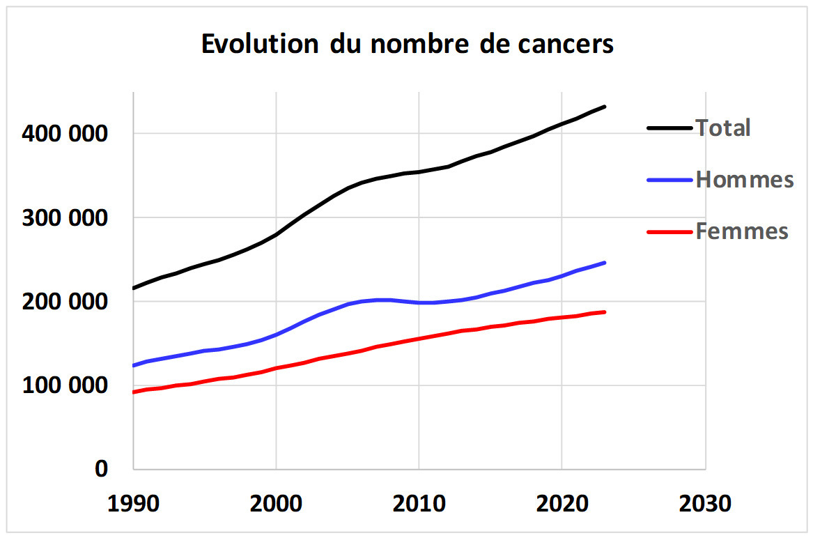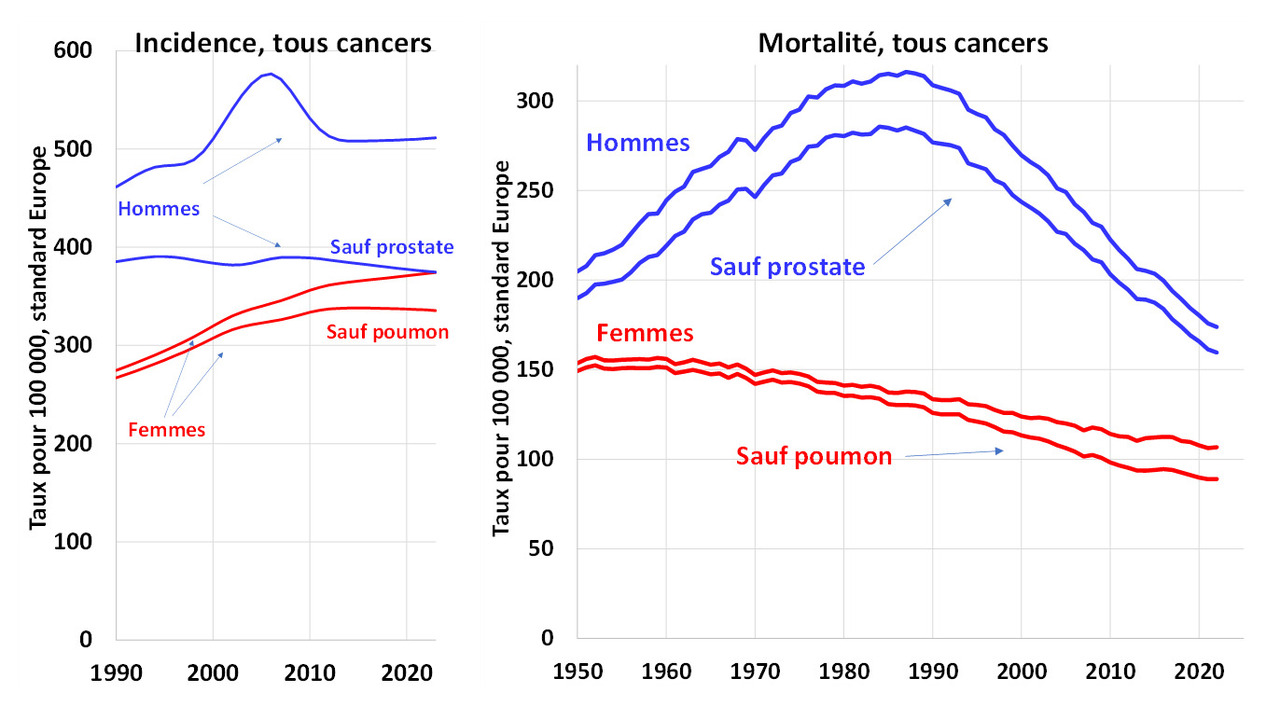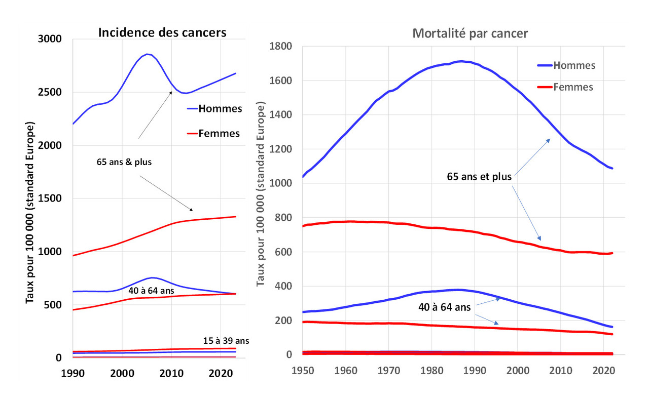 En dehors des conséquences de l’entrée des femmes dans le tabagisme à la fin des années 1960, l’incidence des cancers n’augmente pas ou très peu en France dans les années récentes, et la mortalité par cancer diminue nettement, davantage chez les hommes que chez les femmes. L’incidence n’augmente que dans certaines classes d’âge, et la mortalité n’augmente dans aucune classe d’âge.