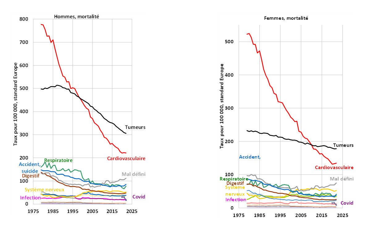 Le cancer est la première cause de décès en France : c’est vrai depuis 1998 et 2009 respectivement chez les hommes et les femmes. Néanmoins, la figure 4 montre que c’est parce que la mortalité cardiovasculaire diminue beaucoup plus rapidement que la mortalité par cancer.
