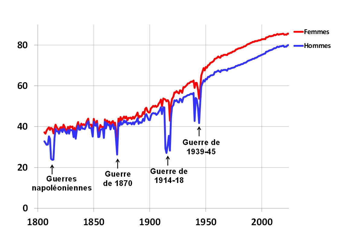 Par conséquent, l’espérance de vie augmente (figure 5). L’espérance de vie pour une année donnée, par exemple 2024, se calcule ainsi : on prend une population fictive de 100 000 personnes qui naissent en 2024 ; on suit cette population jusqu’à ce tout le monde soit « mort » en utilisant les taux de mortalité observés en 2024 pour chaque âge. La moyenne des durées de vie ainsi obtenue est l’espérance de vie. Cette figure montre que l’espérance de vie était d’environ 40 ans jusqu’au milieu du XIXe siècle et a ensuite augmenté pour atteindre, en 2024, 85,6 ans pour les femmes et 80,0 ans pour les hommes. La pandémie de Covid a temporairement arrêté l’augmentation de l’espérance de vie, mais en 2024 l’espérance vie des femmes a retrouvé le niveau de 2019 et l’espérance de vie des hommes a un peu dépassé le niveau de 2019. Certains prédisent que l’espérance de vie va cesser bientôt d’augmenter, mais on peut leur objecter que :
