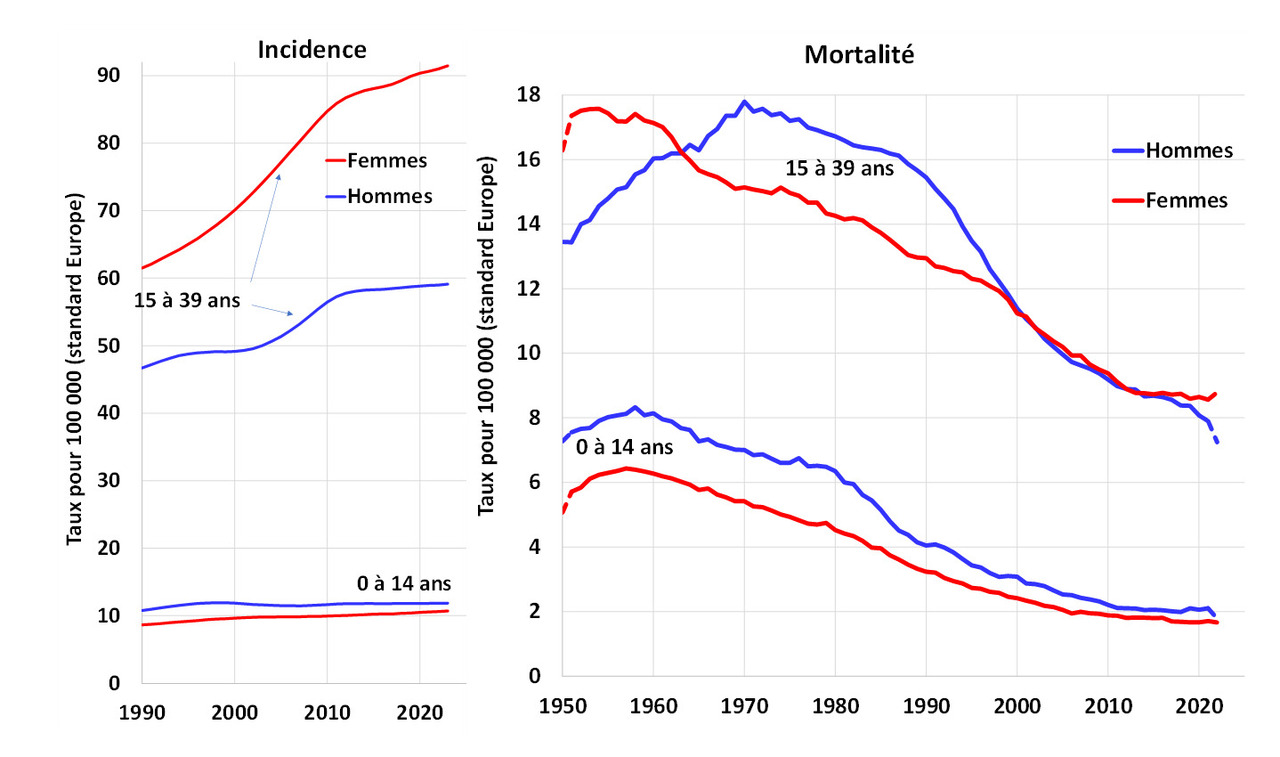 Entre 15 et 39 ans, l’incidence a augmenté fortement jusqu’en 2012 chez les hommes et chez les femmes, mais l’augmentation est moindre dans les années récentes ; la mortalité diminue chez les hommes depuis 1970 et chez les femmes depuis 1960 (figure 3b).