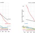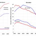 Entre 0 et 14 ans, l’incidence n’augmente pas chez les garçons et augmente très faiblement chez les filles, et la mortalité diminue depuis la fin des années 1950 (figure 3b).